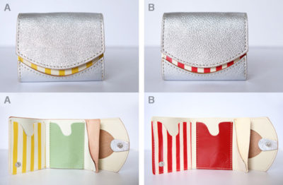 by クアトロガッツヌメ5DAYSのトリを飾る小さいふ。 同じ色あわせで赤青黄がAは線、Bは丸になっているコンビです。 本体はフルベジタブルタンニンの栃木レザーのヌメ革。