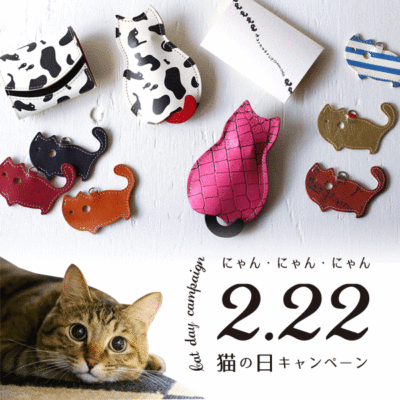 2月22日(水)は「にゃん・にゃん・にゃん」猫の日。 猫モチーフの革小物をたくさんつくっているクアトロガッツですが、実は「クアトロガッツ」とはスペイン語で「4匹の猫」という意味で猫好きスタッフも多く猫の日に黙ってはおれぬ […]