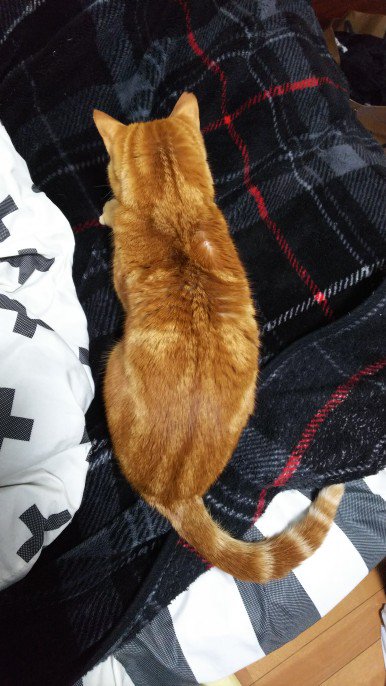 もっちもちと毛布を揉むチャトラ坊。 #猫の日 #猫の後ろ姿 #小さいふ