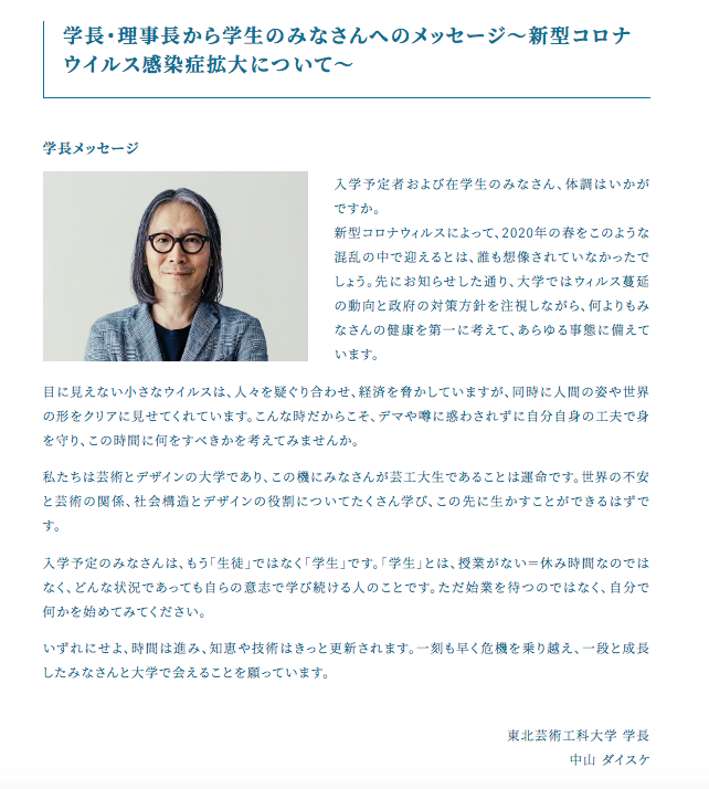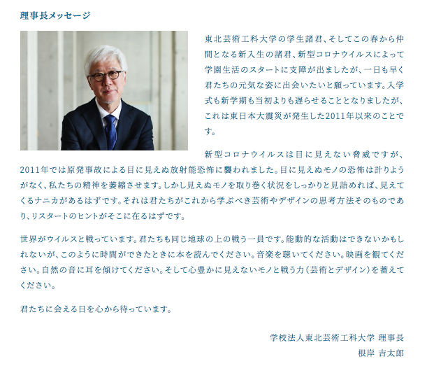 東北芸術工科大学 学長・理事長から学生のみなさんへのメッセージ~新型コロナウイルス感染症拡大について~