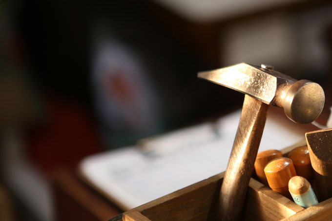 工房ではミシンの音、カナヅチの音