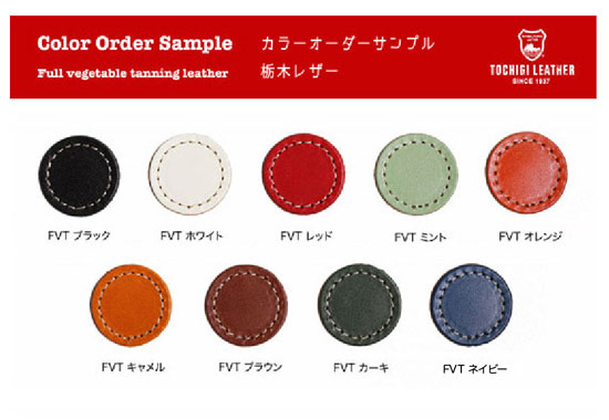 各アイテムのカラーオーダーページにあるFVT(栃木レザー) 革サンプル全9色