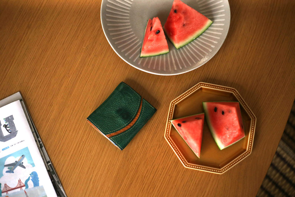 写真はスイカと「ウィケット&クレイグ」の経年変化した小さいふ。