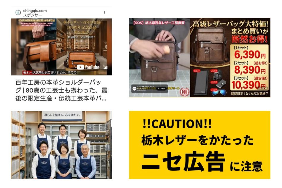テレビ番組「ミヤネ屋」で取り上げられたのは、SNS広告で栃木レザー廃業という嘘をかたり、職人の給料のために利益度外視の最終処分の格安販売という内容で、偽物を平均価格を大きく下回る値段で販売している業者の存在でした。